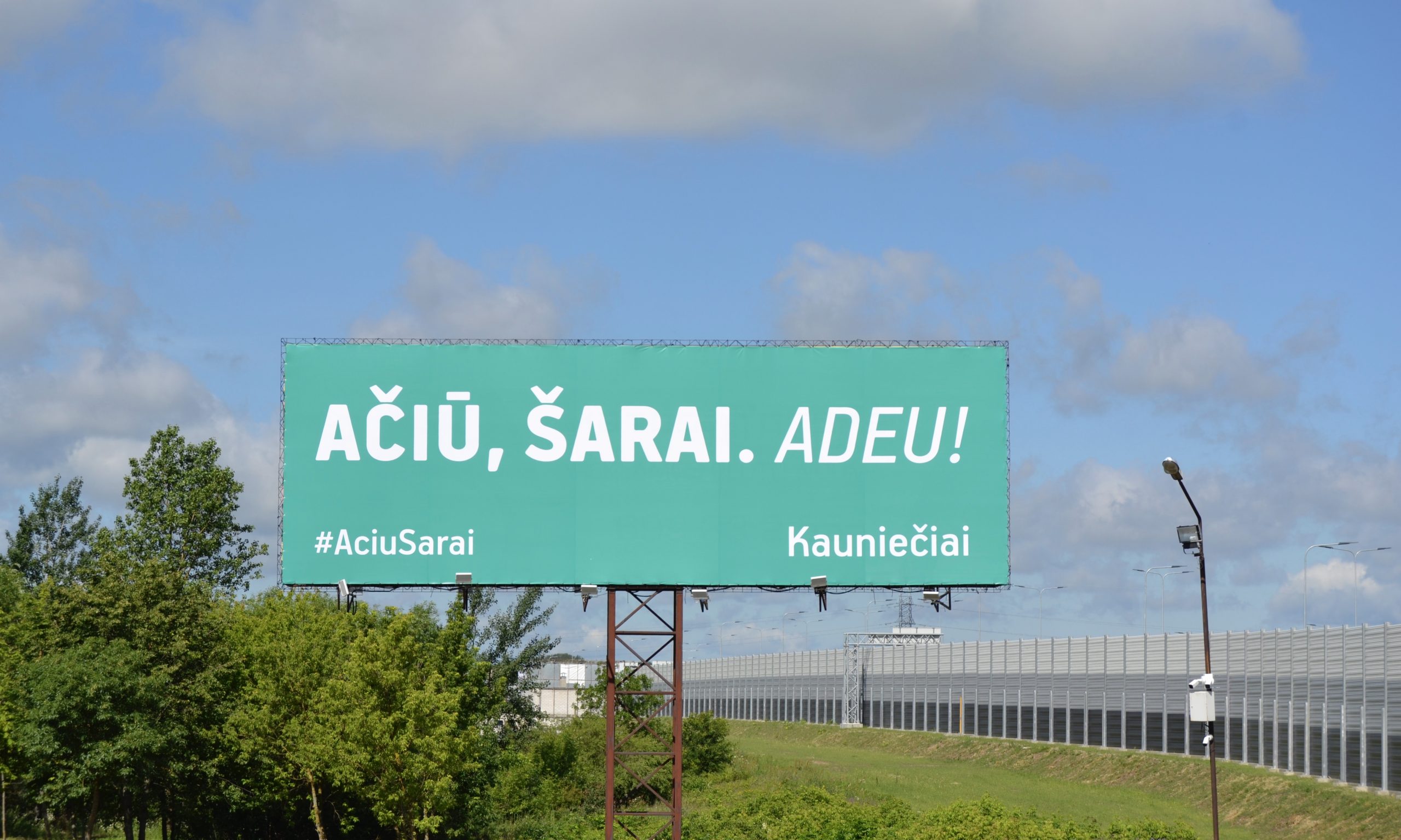 Kaune, greta kelio A1 iškilęs didžiulis plakatas „Ačiū, Šarai. Adeu!“, vos pasirodęs penktadienio popietę, netruko sulaukti visuomenės reakcijų ir žiniasklaidos dėmesio.