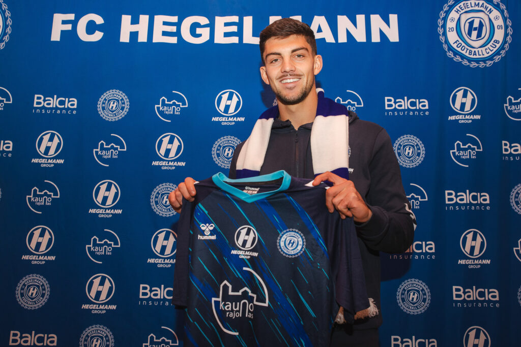 Kauno rajono FC „Hegelmann“ oficialiai sukirto rankomis su 23 metų vidurio gynėju iš Ispanijos Angeliu Puerto, kuris mėlynai baltų gretose vilkės 5 numeriu pažymėtus marškinėlius.
