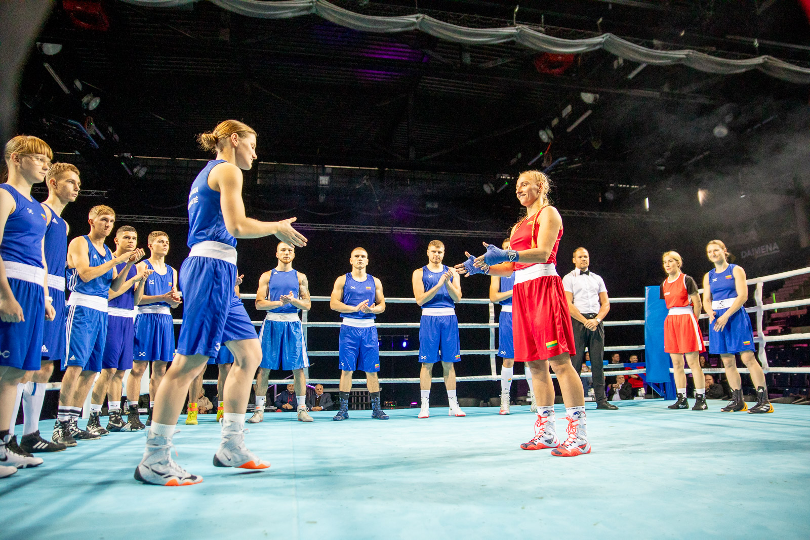 Pirmoji dienos kova baigėsi panevėžietės Marijos Šmakotinaitės (svorio kategorija iki 48 kg) pergale. Boksininkė rezultatu 5:0 (30:27, 30:27, 30:27, 30:27, 30:27) įveikė šilutiškę Enriką Miknevičiūtę ir tapo Lietuvos čempione.